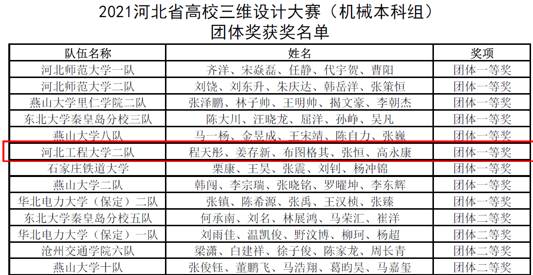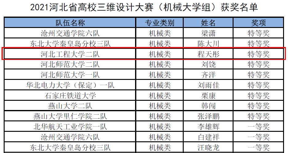近日,2021年河北省三维设计大赛在线举行。必赢官网学生在大赛中,取得喜人成绩:程天彤同学获得特等奖,姜存新同学获一等奖,布图格其、张恒获得二等奖,高永康获得三等奖,必赢437官方网站二队获团体一等奖,这是必赢官网自2016年参赛以来首次取得该项赛事团体一等奖。